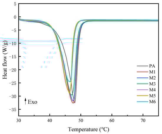 The DSC curves of PA and CPCMs M1–M6 are depicted in Figure 6, and the thermophysical parameters are shown in Table 4. The results indicate that the introduction of thermally conductive filler EG and a flame retardant reduces the latent heat of the PCMs. The peak phase change temperature of PA is observed at 45.34 °C, corresponding to a maximum latent heat of 227.45 J/g. Upon the addition of 5% EG, the peak temperature of M1 decreases to 45.27 °C, with a maximum latent heat of 192.61 J/g. Further incorporation of flame retardant into this base results in a decrease in latent heat from 179.78 J/g for M2 to 133.72 J/g for M6, accompanied by a reduction in peak temperature from 45.33 °C to 44.67 °C. These findings suggest that the latent heat of the flame-retardant CPCMs is primarily determined by the proportion of PA. A lower percentage of PA leads to a decrease in the latent heat of the flame-retardant CPCMs [,]. The incorporation of a flame retardant slightly lowers the peak temperature of the materials. Overall, the incorporation of EG and flame retardants improves the thermal conductivity of the materials, facilitating a faster heat transfer. As a result, the materials undergo continuous melting and release latent heat at lower temperatures, leading to a reduction in peak temperature.