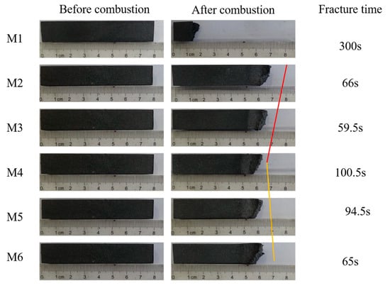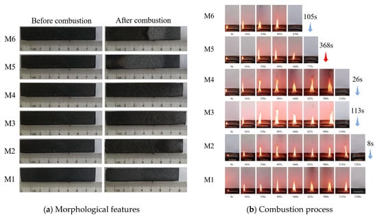 The photograph in Figure 7 depicts the before and after images of suspended horizontal combustion melting experiment and fusing of flame-retardant CPCMs with varying flame-retardant contents. Prior to the addition of any flame retardant, the fusing time for M1 was 300 s. However, upon incorporating flame retardants, the fusing times for M2 to M6 were recorded as 66 s, 59.5 s, 100.5 s, 94.5 s, and 65 s, respectively. These data reveal a trend: as the proportion of flame-retardant increases, the fusing time of the samples initially decreases, then increases, and finally decreases again. The rationale behind this phenomenon lies in the gradual increase in material density with the addition of flame retardants. Due to variations in material distribution uniformity and the influence of gravity, the fusing time decreases. When the flame-retardant addition reaches 15%, the fusing time begins to decrease once more, indicating that the incorporation of flame retardants can significantly reduce the fusing time of CPCMs. In fact, the fusing time can be shortened by up to 4.61 times with the optimal flame-retardant content.