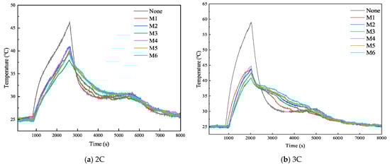 Figure 2 shows the construction of the experimental platform and the arrangement of the thermocouples. The entire system includes a thermostat providing an ambient temperature of 25 °C; a battery charge–discharge cycling instrument for charging and discharging the battery; an Agilent data acquisition module for collecting battery temperature data and uploading it to a computer terminal; and a computer terminal for recording the temperature data. The synthesized PCMs containing different proportions of flame retardants were pressed into ring shapes with a thickness of 16.5 cm using a mold and superimposed onto the 18650 single cell battery to ensure that the battery casing was completely encapsulated by the PCM. The single-cell battery was charged and discharged both in the air and while wrapped in M1-M6, with discharge rates set in two groups (2C and 3C) and a charge rate of 1C. The specific operating conditions are shown in Table 3. In this experiment, to avoid accidents, each set of experiments was repeated at least twice, and the average values of the two experimental data sets were analyzed.