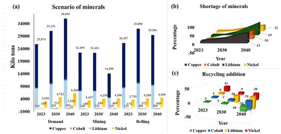 | Lithium | Australia (53%), Chile (32%), and China (13%) | Lithium-ion batteries (LIBs) (59%), ceramics and glass (9%), lubricating greases (8%), casting and alloy industries (3%), air conditioning (3%), and primary aluminum manufacturing (1%) | In 2030, the global demand for lithium is expected to be more than quadruple the demand in 2022, having increased from 720,000 metric tons to a forecasted 3.1 million metric tons. | [25,26] |
