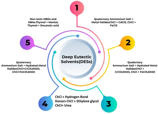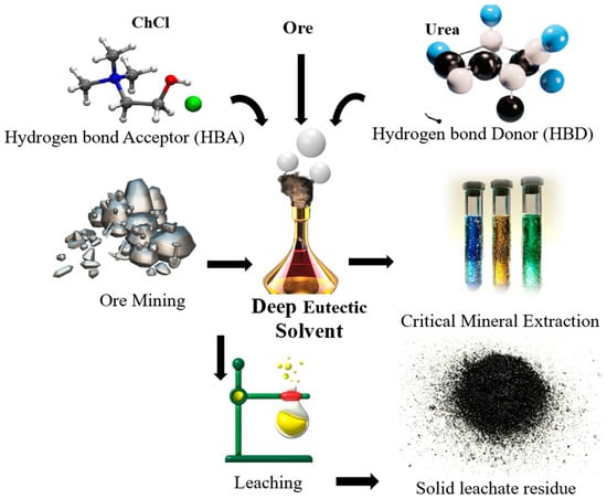 | Deep Eutectic Solvents | Combination of hydrogen bond donor (HBD) and a hydrogen bond acceptor (HBA); these can be either bio-based or non-bio-based compounds | Low toxicity, low volatility, and high thermal stability. Specific characteristics (tunable polarity, viscosity, and solubility) | Direct extraction of copper from copper sulfide minerals, recovery of mineral from spent batteries and e-waste, and green leaching of chalcopyrite, sulfide ore, gold, and silver ore | Applications across various industries and processes such as catalysis and electrochemistry, and as reaction media for organic synthesis | [107,108] |