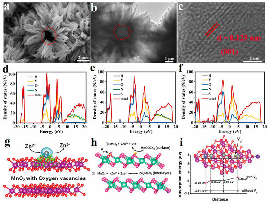 As a common anion vacancy, oxygen vacancy (Vo) is widely used to modify the surface chemistry of cathode materials for ZIBs. Oxygen vacancies can adjust the local electronic structure. This affects the Gibbs free energy of Zn2+ adsorption on the surface, facilitating reversible Zn2+ intercalation/deintercalation. On the other hand, oxygen vacancies can reduce stress and electrostatic repulsion between nearby layers, which helps to overcome transfer and diffusion obstacles, enhancing charge transfer and ion diffusion during the reversible Zn2+ intercalation/deintercalation [9]. Under low oxygen pressure or reduction conditions, oxygen atoms are easily extracted from the lattice, creating oxygen vacancies. For instance, oxygen vacancies were introduced into α-MnO2 by treating it with NaBH4, which weakened the Zn–O bond and facilitated the involvement of more electrons during charge/discharge [47]. Studies have shown that oxygen defects can improve conductivity by altering the local electronic structure. Combining defect engineering with other modification approaches, such as nanostructure design and interlayer engineering, is also a promising strategy. Zhang et al. [48] constructed an electrode (labeled 3D-NPG@S-NVO@CTAB) with oxygen vacancies and performed the intercalation of S and CTAB (Figure 3a–c). The density functional theory (DFT) results confirmed that H+/Zn2+ insertion into MnO2 containing oxygen defects caused smaller charge depletion regions, suggesting that oxygen defects in MnO2 were advantageous in terms of enhancing conductivity and boosting charge migration (Figure 3d–f). Xiong et al. [49] employed DFT simulation to assess the oxygen-deficient MnO2 (Figure 3g). The results showed that Gibbs free energies of Zn2+ adsorption near VO in oxygen-deficient MnO2 were close to thermoneutral (≈0.05 eV), in contrast to pristine MnO2, which exhibited much lower values (≈−3.31 eV).