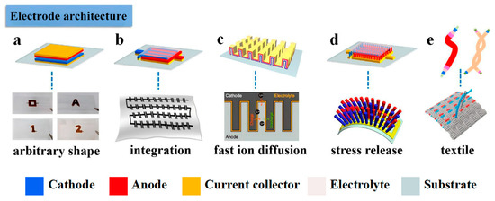 Generally, micro-batteries (MBs) have a small footprint, typically in the range of square millimeters or square centimeters, with electrode thickness restricted to the micron level or to sub-cubic-millimeter volumes for 3D configurations [6,7]. It is noted that, unlike conventional batteries, achieving high electrochemical performance is more challenging for MBs due to their limited space or footprint area. The electrode serves as the key component of MBs, with its material composition, microstructure, fabrication techniques and spatial configuration collectively influencing the overall electrochemical performance of MBs. Hence, the design of both electrode materials and architectures requires ingenuity and modern fabrication techniques in order to achieve high-performance MBs.