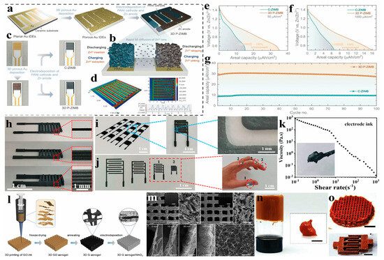 Although numerous efforts have been conducted to advance cathode materials with superb performance, the energy density of ZIMBs remains insufficient for practical applications. Apart from the cathode material, the mass loading and structural stability of the microelectrodes also play a crucial role in determining the capacity of ZIMBs. Because of the limited area of 2D geometry, the innovative 3D architecture electrode has emerged. Increasing the mass loading within the constrained footprint area is an effective solution for boosting the energy density of MBs. To this end, 3D architecture electrodes take full benefit of the vertical dimension (height) to increase the surface-to-volume ratio and enable more mass loading [52]. For example, Naresh et al. [54] introduced porous 3D Au scaffold-based electrodes (IDEs) as current collectors, facilitating the efficient loading of PANI and Zn, respectively (Figure 5a–c). The measured thicknesses of the Zn and PANI for the 3D architecture electrodes are 7 and 17 μm, respectively (Figure 5d), which are much higher than those for flat Au electrodes (6 μm and 11 μm, respectively). In the 3D P-ZIMB, the areal capacities rise from 15 to 35 μAh cm−2 at 50 μA cm−2 and from 6.8 to 16 μAh cm−2 at 1000 μA cm−2 compared to the C-ZIMB (Figure 5e,f). Even at higher areal currents, the 3D P-ZIMB achieves a substantial enhancement in areal capacity (≈135%). Its areal capacities are markedly superior to those of the C-ZIMB (Figure 5g). In general, 3D direct printing is employed to construct 3D electrodes. Printed electrodes were fabricated with 1, 3, and 5 layers, exhibiting proper device formation without any shape distortion. The patterned electrodes reached a maximum height of approximately 2.5 mm with a footprint of around 1.5 cm × 1.5 cm (Figure 5h) [55]. The printed interdigital electrodes demonstrated good consistency. The optical microscopy of the magnified local view of the electrode reveals the solid electrode’s clear formation, featuring sharp corners and clean gaps between interdigital legs. Moreover, interdigital electrodes of various sizes can be accurately manufactured, with the minimum spacing between adjacent electrodes reaching 100 μm (Figure 5i). MBs of varying miniaturized sizes can be efficiently attached to the limited surface area of fingers (Figure 5j), showcasing adjustable miniaturization to suit diverse application needs. The gel-like inks, possessing controlled fluidity, allow for smooth extrusion from the nozzle at a regulated speed, preventing clogging (Figure 5k). Yao et al. [56] demonstrated printed graphene electrodes with high MnO2 loading (182.2 mg cm−2) (Figure 5l,m), achieving a fairly high areal capacity. Combining picketing emulsion and direct ink writing, Huang et al. developed free-standing, porous polymer foams (Figure 5n,o) [57].