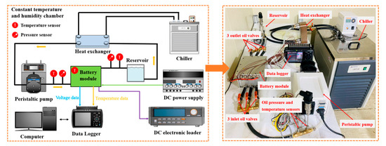 The immersion cooling experimental setup schematic diagram for the 5S7P battery module is displayed in Figure 2. A TOYOTECH TEX60-400 power supply (Aichi, Japan) was used to charge the battery module. The power supply had a maximum operating power of 24 kW, with operating voltage and current ranges of 60 V and 400 A, respectively. The battery module was discharged using a TOYOTECH TLF5000-A electric loader. The electric loader had a maximum operating power of 5 kW with operating voltage and current ranges of 150 V and 800 A, respectively. The coolant oil was cooled using a 5 kW JWT-30 chiller and heat exchanger, which also controlled and maintained the coolant oil’s inlet temperature. To circulate the coolant oil in the immersion cooling system, a JIHPUMP peristaltic pump was utilized, which has an operating range of 0.4 mLPM to 2200 mLPM. The Data Logger GL820 was used to collect voltage, temperature, and pressure data of the battery module during the experiment. Nine T-type thermocouples were attached to the surface of different battery cells with an operating range of temperature from −220 °C to 400 °C. All experiments were carried out with an ambient temperature setting of 25 °C in a constant temperature and humidity chamber.