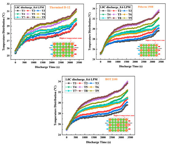 The temperature distribution in the immersion cooling battery module with different types of coolant oils is shown in Figure 3. The findings indicate that the temperature in the battery module tends to increase gradually along the coolant oil flow direction. Specifically, the temperature of the battery cells near the coolant oil inlet (T1–T3) is the lowest due to direct contact with the coolant oil at low temperatures. On the other hand, the battery cells in the middle and end regions of the module (T4–T6 and T7–T9) have higher temperatures, with the highest values at the locations near the coolant oil outlet (T7–T9). This difference is explained by the decreasing heat dissipation efficiency along the flow direction. In the area near the coolant oil inlet, the high-temperature gradient between the coolant oil and the battery cells enhances the heat transfer process, resulting in a lower temperature. However, in the area near the outlet, the coolant oil has exchanged heat with the previous battery cells, causing its temperature to increase. This reduces the temperature gradient between the coolant oil and the battery cells, resulting in lower heat dissipation efficiency and higher temperatures. Notably, the temperatures at locations T5 and T8 were found to be the highest in the battery module. This is mainly because these locations are located in the center and near the outlet of the coolant flow, where the most heat accumulates during operation. This explains the appearance of hot spots in the module, especially in the central and near-end regions of the flow.