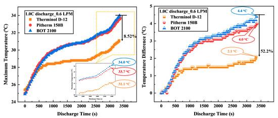 In this section, the impact of different types of coolant oils on the cooling efficiency of immersion cooling for 5S7P battery modules was evaluated including Therminol D-12, Pitherm 150B, and BOT 2100. The parameters evaluated included Tmax, ∆T, HTC, and ∆P. Experiments with different coolant oils were conducted under the same conditions of a 0.6 LPM volume flow rate, a constant coolant oil inlet temperature, and ambient temperature maintained at 25 °C.