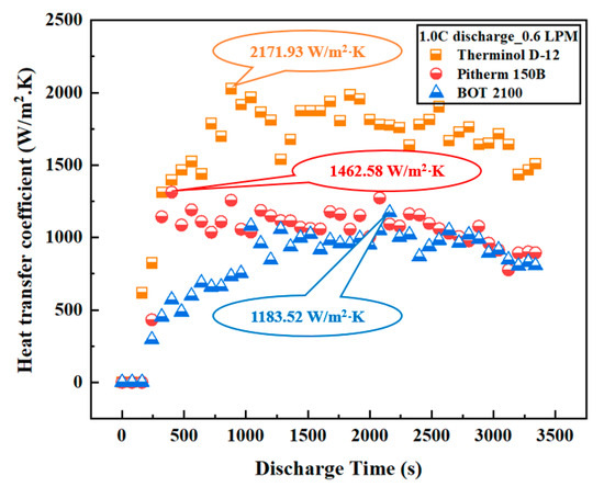 Figure 5 displays the change in the HTC over time for various coolant oil types. The HTC showed a clear difference between the oils based on their physical and thermal properties. Therminol D-12 achieved the highest heat transfer efficiency, with an HTC of 2171.93 W/m2⋅K. This can be explained by the superior properties of Therminol D-12, including high specific heat capacity and thermal conductivity, along with low viscosity and density, which optimize the heat transfer process. In contrast, although Pitherm 150B and BOT 2100 have a higher specific heat capacity and thermal conductivity than Therminol D-12, they are limited by their higher density and viscosity. These factors increase the resistance to heat transfer, resulting in lower HTC values of 1462.58 W/m2⋅K and 1183.52 W/m2⋅K. This result emphasizes the importance of balancing the fluid’s thermophysical and dynamic properties in improving the system’s cooling performance.