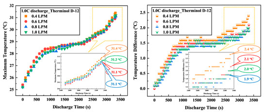 In this section, the influence of the optimal coolant oil proposed in Section 3.1 with different VFR values on the cooling effectiveness of immersion cooling was analyzed. Specifically, Therminol D-12 with different VFR values, ranging from 0.4 LPM to 1.0 LPM, was studied under the condition of discharge rate of 1.0C. The coolant oil and ambient temperature were maintained at 25 °C.