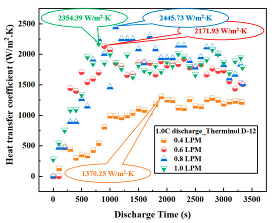 Figure 8 shows the variation in the HTC of Therminol D-12 with different VFRs at a discharge rate of 1.0C, demonstrating the significant impact of VFR on cooling performance. At a VFR of 0.4 LPM, the HTC reached 1370.25 W/m2⋅K, the lowest among the flow rates, due to the slow flow rate resulting in limited heat exchange capacity. When the VFR was increased to 0.6 LPM and 0.8 LPM, the HTC increased significantly to 2171.93 W/m2⋅K and 2445.73 W/m2⋅K due to the improvement in convection capacity and heat transfer efficiency. However, at 1.0 LPM, the HTC decreased slightly to 2354.39 W/m2⋅K, possibly due to the occurrence of heat transfer efficiency degradation when the coolant flow rate was too high, causing flow disturbance and reducing the heat contact time. This result emphasizes that, although increasing the coolant oil VFR improves the cooling efficiency, it is necessary to optimize the VFR to achieve a balance between heat transfer efficiency and energy efficiency, with the optimal VFR in this case being approximately 0.8 LPM.