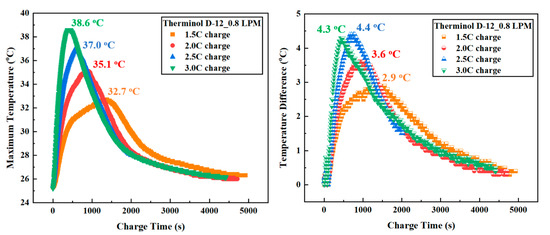 The results in Figure 10 show that the immersion cooling system with Therminol D-12 oil and an optimized VFR of 0.8 LPM maintained the Tmax of the battery module within the control range even at high charging rates. Specifically, the Tmax values measured were 32.7 °C, 35.1 °C, 37.0 °C, and 38.6 °C at charging rates of 1.5C, 2.0C, 2.5C, and 3.0C, respectively. These values are all below the optimal temperature threshold for lithium-ion batteries, ensuring thermal safety and minimizing the risk of performance degradation or battery failure. The increase in temperature with the charging rate is inevitable due to the larger current, but the immersion cooling system demonstrated effective thermal control, ensuring that the maximum temperature did not exceed the dangerous threshold. This confirms the important role of the immersion cooling system in ensuring stable battery operation even under harsh charging conditions.