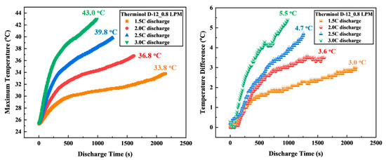 The Therminol D-12 oil immersion cooling system and 0.8 LPM VFR demonstrated the ability to maintain the Tmax of the battery module inside the near-optimal range at high discharge rates, as shown in Figure 11. Specifically, the Tmax reached 33.8 °C, 36.8 °C, 39.8 °C, and 43.0 °C at discharge rates of 1.5C, 2.0C, 2.5C, and 3.0C, respectively. While the Tmax from 1.5C to 2.5C was within the ideal range (below 40 °C), the temperature at 3.0C (43.0 °C) was slightly above this range. However, this temperature level was still acceptable and did not pose a serious risk of overheating. This result confirms the effectiveness of the immersion cooling system in temperature control, helping to maintain stability and safety for the battery even when operating at high discharge rates where rapid temperature increases are inevitable.
