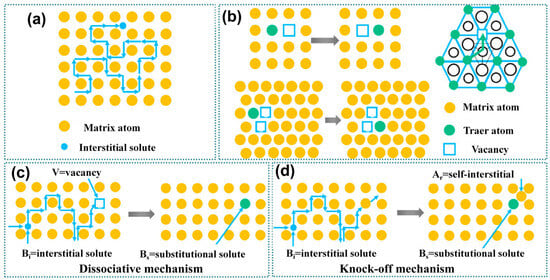 The vacancy mechanism is employed in replacement solid solutions, where atoms migrate via leaping to neighboring vacancies (Figure 1b) [41,42]. For replacement solid solutions, a tiny diversity of atomic diameter would hinder the occurrence of interstitial diffusion. The above discussion demonstrates the importance of vacancy diffusion in the solids [35]. Generally, a multi-vacancy mechanism would execute when plenty of vacancies generate via doping in order to increase ionic conductivity. Atoms can diffuse through the interaction of interstitial lattice sites when atoms possess interstitial and lattice sites simultaneously [35]. The interstitial substituent interaction generally generates if the concentration of the interstitial solute atoms is lower than that of the substituent atoms. The dissociative mechanism is used when the diffusion is accomplished through vacancies (Figure 1c). Otherwise, the collective diffusion mechanism would exist, where several atoms migrate in a chain-like or track-like path simultaneously (Figure 1d). Both the knock-off sub-mechanism and the self-gap mechanism are typical collective diffusion mechanisms.