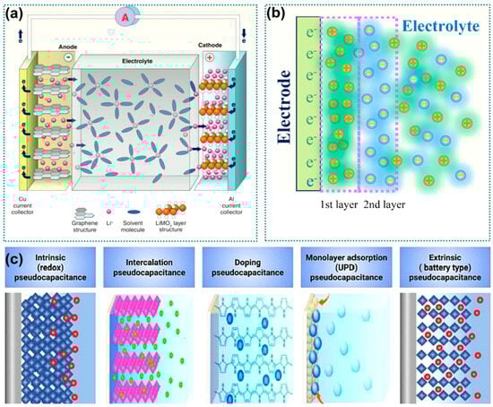 Schematic diagram of (a) Li-ion battery [35,48], and (b) electrochemical reaction in double-layer capacitors [25,35,48]. Copyright 2024, American Chemical Society. (c) Classification of pseudocapacitance mechanism [49]. Copyright 2023, Elsevier.