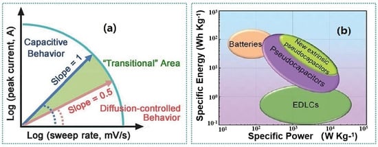 In Equation (3), a and b are symptomatic parameters and correspond to the nature of the reaction kinetics [118,119]. The parameter b equals the slope of the log (peak current) versus log (sweep rate) linear plot (Figure 3a), which reveals the pseudocapacitive mechanisms involved in the reaction. If b = 1, the capacitive contribution, which is controlled by the near-surface electrochemical process including pseudocapacitance and EDLC, dominates the storage [26]. For example, the Nb2O5 electrode, with “b” value close to 1, shows intercalation pseudocapacitance which can be attributed to a surface phenomenon [92]. Nevertheless, the “b” value of bulk materials, like LiFePO4, is 0.5, indicating the diffusion-controlled faradic reactions (Figure 3a) [119]. That is to say, diffusion-controlled faradic mechanisms tend to decrease the “b” value, while the capacitive process contributes to raising the “b” value [26]. When the “b” value is between 1 and 0.5, corresponding to the green area (named as transition region) in Figure 3a, the electrode would exhibit an intermediate electrochemical feature between battery type and capacitive behaviors [26,118,120,121]. The role of pseudocapacitance and extrinsic pseudocapacitance among the energy storage devices is shown in Figure 3b according to Yu et al. [20]. Pseudocapacitors balance the high energy of batteries and the high power of EDLCs (Figure 3b).