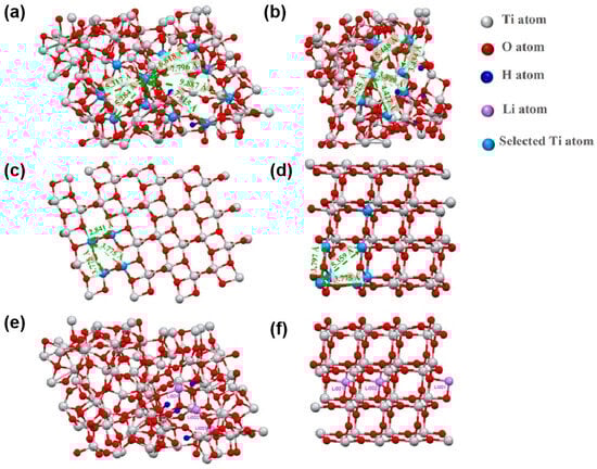Structural models of amorphous titanium oxide (a,b) and anatase TiO2 (c,d) [149]. Structural models of amorphous titanium oxide (e) and anatase TiO2 (f) after Li+ insertion. The light blue spheres stand for the selected Ti atoms in open channels [149]. Copyright 2023, Elsevier.