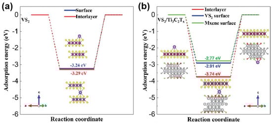 Theoretical calculations. Adsorption energy of one Na atom adsorbed on the surfaces and in the layers of (a) VS2-VS2 and (b) VS2-Ti3C2Tx [150]. Copyright 2023, Wiley.