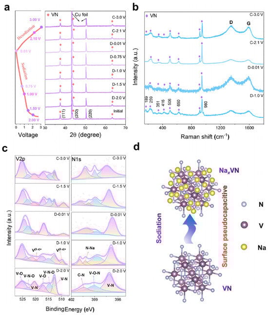 (a) Charge/discharge profiles of VN@CF at 0.1 A/g and corresponding ex situ XRD patterns. (b) Ex situ Raman spectra. (c) Ex situ XPS spectra of V2p and N1s. (d) The schematic illustration for the Na+ storage behavior [133]. Copyright 2023, Elsevier.