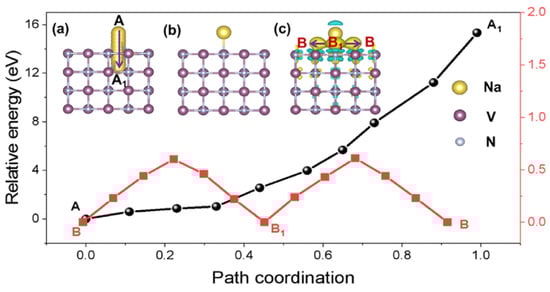 DFT calculations of relative energy variations along two migration paths. The insets display the Na-ions insertion path into the (a) VN bulk (A → A1), (b) optimal Na ions adsorption onto (002) plane of VN, and (c) Na-ions diffusion between two neighboring sites (B/B1), respectively [133]. Copyright 2023, Elsevier.