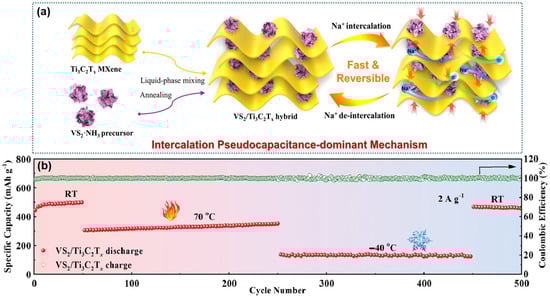 (a) Preparation process and storage mechanism of the VS2/Ti3C2Tx hybrid [150]. Copyright 2023, Wiley. (b) All-climate long-term cycle performance of VS2/Ti3C2Tx at 70 and −40 °C at 2 A/g [150]. Copyright 2023, Wiley.