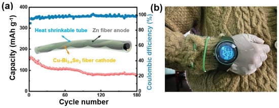 (a) The cycle performance of quasi-solid fiber-shaped Cu-Bi2−xSe3//Zn battery at 0.05 A/g; the inset is the schematic illustration of the as-prepared fiber-shaped battery [187]. (b) Photograph of the flexible fiber-shaped Cu-Bi2−xSe3//Zn battery wearable application [187]. Copyright 2023, Wiley-VCH.