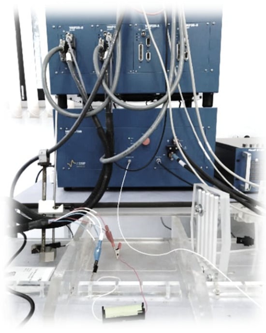 The VSP electrical laboratory equipment of BioLogic [63] was employed for impedance acquisition within all measurements. This system consists of a single computer board associated with four potentiostat channel boards, which make the VSP a very versatile multichannel potentiostat. A modular booster unit module of 100 A was used, and all the data were acquired, processed, and analyzed through EC-Lab software (version v11.61). In Figure 1, the setup prepared for the LIB measurements is shown, in which the cells are connected to the VSP cables through crocodile clips.