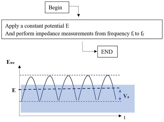 The PEIS experiment was employed, performing impedance measurements in potentiostatic mode. We registered the frequency-dependent impedance, with a particular focus on monitoring the variation in imaginary impedance values against the frequency oscillations. As such, we evaluated the heterogeneous charge-transfer parameters with high precision. Figure 2 shows the PEIS general diagram, in which the potential of the working electrode follows the equation below [64]:
