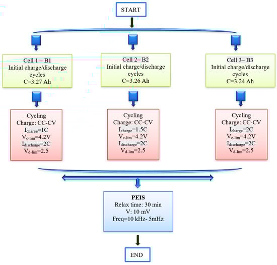 By monitoring the voltage change difference after 30 min, we obtained a value smaller than 0.1%, indicating that the cells are in a stable state. The initial capacity of all three LIBs had closely related values, namely, 3.27 for B1, 3.26 for B2, and 3.24 for B3. The workflow diagram presented below in Figure 3 shows schematically the aging procedure applied in this investigation.