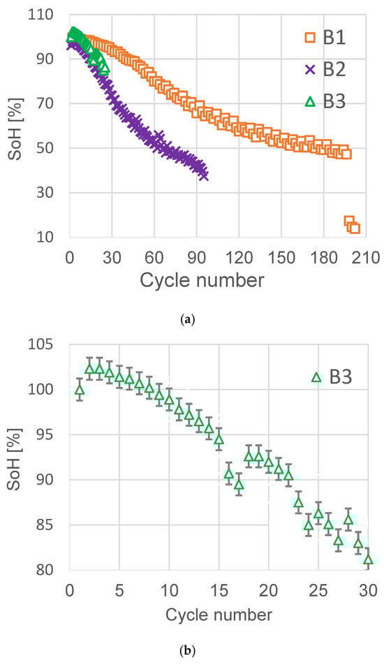 The capacity testing through the controlled (fast) charge–discharge rates of B1, B2, and B3 is shown in terms of the SoH vs. the cycle number in Figure 4a. Here, we define the charge or discharge current as a function of the capacity. As can be seen, when the Icharge is increased from 1C to 1.5C and 2C, the SoH decay curves behave differently, even if Idischarge remains constant at 2C. For B1, a smooth decay curve was obtained, and around 200 cycles were required until the battery was exhausted. An approximate half-cycle number of around 95 was obtained for the B2 cell when the Icharge was increased to a fast 1.5C, thus reducing the battery exhausting period by more than half. It seems that the gradual loss of the B2 charge storage capacity led to a significant reduction in performance, significantly affecting the loss of active lithium ions (i.e., lithium becomes trapped in the electrode side reactions), electrode degradation through structural damage to cathode or anode materials, or SEI (solid electrolyte interface) layer growth on the anode. Degradation due to repeated charge–discharge cycles occurred extremely fast for B3 when the fast charge rate of 2C was equal to the deep discharge rate. The SoH curve of B3 with error bars is shown in Figure 4b. The internal operation of inserting lithium ions, embedded in the negative electrode during charging, into the positive electrode during discharge became extremely difficult.