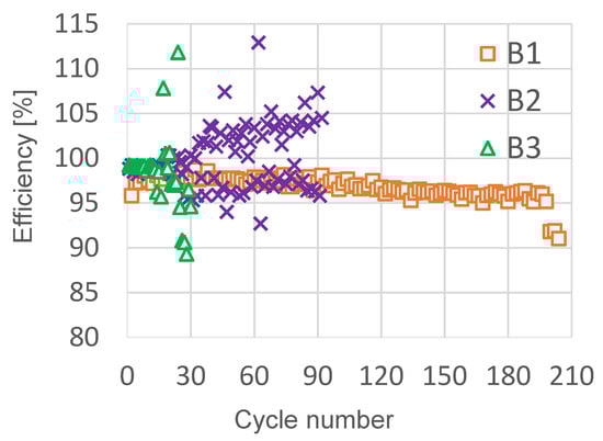 In the second step, in order to evaluate and compare the stability of the B1, B2, and B3 cells, we performed an analysis of the coulombic efficiency (CE) [67]. This parameter can be defined as the ratio of the charge delivered during the discharge, Qdischarge, to that stored during the charge, Qcharge:
