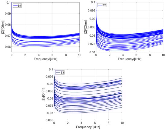 This is not the case for the B2 or, in particular, the B3 cells (see Figure 7—middle and bottom), in which the fast-cycling rates emphasize more dispersive curves. It is clear that the process of inserting the lithium ions, embedded in the negative electrode during charging, into the positive electrode during the discharge, is significantly affected. Specifically, in Figure 7, the LIBs with the longer cycle life have a reduced charge/discharge growth during the PEIS cycling measurements (Figure 7—top). When the fluctuations in Qcharge and Qdischarge become more and more pronounced (Figure 7—middle and bottom), the total charge balance clearly affects the LIB efficiency, which is in full agreement with the results described in Section 3.1. Because the LIBs have a high voltage per cell, with tighter voltage tolerances and the absence of a trickle or float charge at full charge, they cannot easily accept the overcharge. By increasing the charge rate from B1 to B2 and B3 and fully charging the cells, an additional high voltage is added that stresses the battery more and more. This can be translated into a shorter lifetime, as was shown already here. In any case, choosing a lower voltage threshold, or eliminating the saturation charge altogether, will clearly prolong the battery aging process.