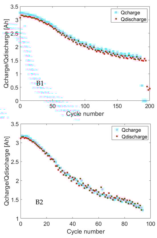 If we look at Figure 7—top, we can observe a smooth curve for the B1 cell type similar to that in the previous section (see Figure 4 and Figure 5), regardless of whether we look at the Qcharge or Qdischarge. This means that at a lower Icharge, the process of lithium-ion extraction from one electrode and the intercalation to the other is not affected during the aging procedure, thus emphasizing a smooth trend.