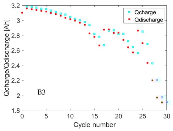 Second, we performed a total charge Q–Q0 analysis. A good agreement with the SoH data was achieved, in which a similar smooth curve for B1 was obtained and more dispersive fluctuations for B2 and B3 cells were seen. During the PEIS cycling measurements, a reduced charge/discharge growth was related to a longer cycle life, while the fluctuations in the total charge balance clearly affected the B2 and B3 efficiency. By increasing the charge rates and charging the cells at 100% SoC, an additional high voltage was added that affected the cells more and more. As a direct conclusion of this result, choosing a lower voltage threshold, or eliminating the saturation charge altogether, will definitely extend the LIBs’ aging process.
