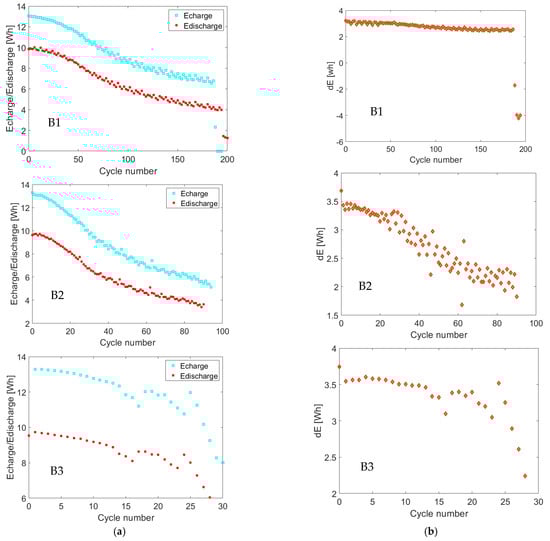In Figure 8, the resultant values (left) are shown together with the dE—the difference between the charge and the discharge states (right). The shifting of the curves that appears now in Figure 8 for B1, B2, and B3 (a), in comparison with those illustrated in Figure 7, comes from the V factor, but the trend is very similar. It is known that LIBs operate within a specific voltage range (typically from around 4.2 V when fully charged to around 3.0 V when discharged). As the voltage decreases during discharge, the amount of energy available from the battery decreases, even if the current is constant.