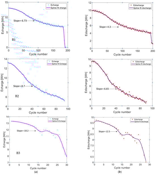 The smoothing parameter, ps, was set to 0.312 to achieve the fidelity of the data and the smoothness of the curve. It can be noticed that the model fit data accurately. The RMSE values stayed below 0.3, a slightly better fit being obtained for the discharged modes. As the current rate increases the slope decreases. The slope is smaller in the charged mode for all cases, as it starts from the maximum energy and decreases toward zero at the end of cycling. In B3, the slope decreased by 37% compared with the slope determined for B1.