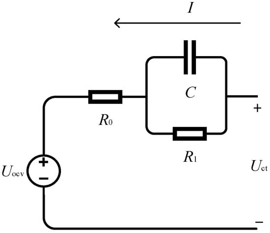 The analysis of the proposed method is explained as follows: Common equivalent circuit models include the Rint model, Randles model, PNGV model, n-order RC model, and RC fractional-order model. These models exhibit varying trade-offs between accuracy and computational complexity. Figure 1 illustrates the Thevenin equivalent circuit model, known for its simplicity and high accuracy. It comprises OCV, Ohmic resistance (R0), polarization resistance (R1), and capacitance. R0 encompasses contact and wire resistances. The terminal voltage of the battery consists of three components: the OCV, the voltage component attributed to R0, and the voltage component shared by R1 and C. R0 refers to the resistance within the battery, comprising the resistance of electrode materials, the electrolyte, and the separator, as well as the contact resistance between various components. R1 refers to the additional resistance generated during the charging and discharging process of the battery due to the electrode reactions. C is used to simulate the charge storage and release behavior of the battery during charging and discharging. Both R0 and R1 are influenced by the current. In Figure 1, when the battery charges, the current I is positive. The current is negative when discharging.