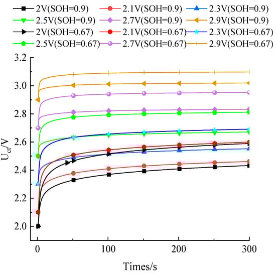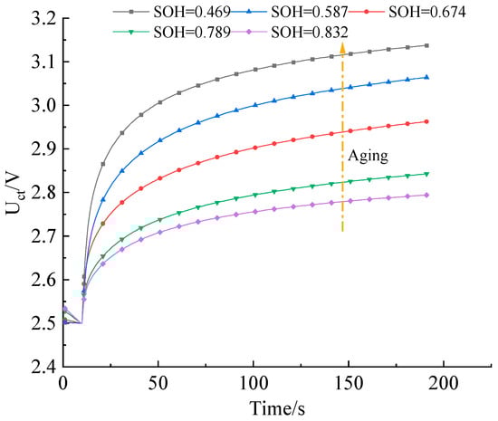 If the discharge voltage lower limit is set too low, the SOC differences among different SOH batteries become minimal, resulting in correspondingly small voltage differences. Typically, for lithium iron phosphate batteries, the discharge voltage lower limit is set between 2 V and 2.5 V to avoid over-discharging, which could cause permanent damage to the battery. If accurate capacity estimation of retired batteries is required, the discharge cutoff voltage should be set as low as possible within a safe range to ensure that high internal resistance batteries are adequately discharged. Conversely, if the goal is to observe voltage differences among different SOH batteries after discharge cessation, the discharge voltage lower limit should not be too low, allowing low SOH batteries to discharge fully while preventing excessive discharge for high SOH batteries. Therefore, in this study, we selected a discharge voltage lower limit of 2.5 V. At this level, the SOC of batteries with high internal resistance and low SOH approaches 0, while the SOC of batteries with low internal resistance and high SOH remains above 0. After discharge stops, the battery terminal voltage rapidly rebounds, and the rate and magnitude of voltage recovery differ among batteries with varying SOHs.