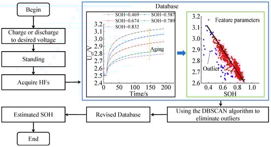 The second section describes the reasons for selecting HFs proposed in this paper from the resting voltage curves and the process of obtaining them. The third section describes the specific process of the rapid SOH estimation method proposed in this paper, as well as how to use the DBSCAN algorithm to filter out outliers in the training dataset. The fourth section verifies the effectiveness of the proposed method by describing the reasons for selecting a discharge voltage of 2.5 V, the impact of outliers on SOH estimation, the improvement in SOH estimation accuracy after removing outliers using the DBSCAN algorithm, and the reduction in SOH estimation time. In summary, this paper makes the following contributions: