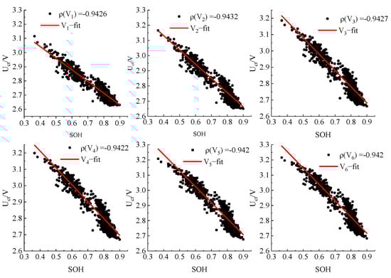 By combining the aforementioned features, this paper can fully utilize the SOH information contained in the voltage during the resting process, thereby improving the accuracy of SOH estimation. Figure 8 illustrates how the correlation ρ between the voltage during battery resting and SOH changes over time. As shown in Figure 8, the correlation between the resting voltage and SOH gradually increases with the duration of resting. As resting time increases, the voltage differences among retired batteries with varying SOHs become more pronounced. Within the same time frame, batteries with lower SOHs exhibit faster and larger voltage changes, resulting in a higher correlation ρ between battery voltage and SOH after 20 s of resting. This motivates our choice of using the battery voltage after 30 s of resting as the HFs. Figure 8 depicts the trend of feature voltages during resting with respect to SOH.