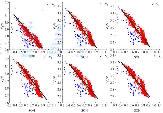 Figure 7 describes the variation of HFs, including V1, V2, V3, V4, V5, and V6, with the SOH of 800 retired batteries in the training set. In Figure 7, as the SOH value decreases, indicating higher battery aging, the corresponding HF values also decrease. However, due to the varying historical operating conditions experienced by different retired batteries, the aging magnitude of HFs differs. Consequently, this correlation is not strictly linear. Relying solely on individual HFs for accurate SOH estimation becomes challenging. Therefore, in the next section, this paper will discuss how to leverage the SVR algorithm in combination with multiple HFs to achieve SOH estimation for retired batteries. As shown in Figure 7, HFs exhibit a negative correlation with SOH.