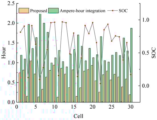 In Figure 10, the initial SOC distribution of the testing set’s retired batteries is depicted using a line graph. The SOC values for these batteries randomly span between 0 and 1. The bar charts in Figure 10 illustrate the time consumption for SOH estimation using both the ampere-hour integration method and our proposed approach under a 20 A charge–discharge current. Notably, our method achieves shorter SOH estimation times for retired batteries with lower SOCs. When the SOC of retired batteries approaches 1, our SOH estimation strategy moderately reduces the time required for SOH assessment. For batteries with an SOC close to 0, our approach significantly shortens the SOH estimation time. Compared to traditional SOH estimation methods, our proposed approach leverages inexpensive battery test cabinets, is applicable to batteries with unknown SOCs, and provides faster testing speeds.