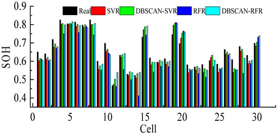 Next, the trained SVR model estimates the SOH for a testing set containing 30 batteries.