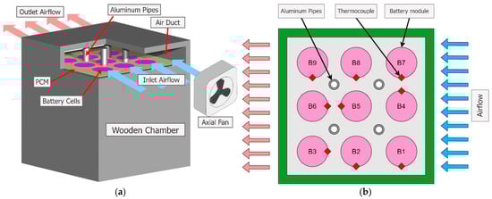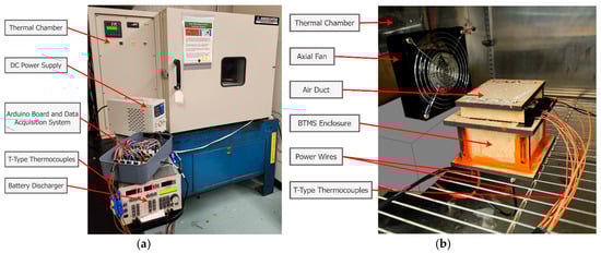 The batteries were interconnected using nickel strips measuring 5 mm in width, 4 cm in length, and 0.5 mm in thickness. Four vertical air pipes with an outer diameter of 6 mm and a wall thickness of 1 mm were installed between the battery cells to facilitate heat dissipation. These air pipes were strategically placed to ensure efficient heat dissipation from the battery cells, thereby maintaining the desired operating temperature. The chosen air pipe geometry was selected based on its consistency with previous research, as well as its symmetry, simplicity, and ease of assembly, in contrast to more complex rectangular or irregular geometries. Aluminum was used for the air pipes. An air duct, matching the length and width of the battery chamber and with a height of 1.9 cm, was placed above the battery pack to dissipate heat from the air pipes. An axial AC fan (GDSTIME 1203) was employed to ensure steady airflow through the duct, achieving an inlet speed of 2.1 ± 0.1 m/s, as measured by a Proster anemometer. The inlet air temperature was controlled using a 227 L (8 cubic feet) thermal chamber (SD-508, Associated Environmental Systems) with an accuracy of ±0.5 °C. The walls of the battery pack were assumed to be adiabatic, implying that all heat dissipation relied exclusively on the air duct. Real images of the thermal chamber and the experimental setup installed inside it are shown in Figure 2.