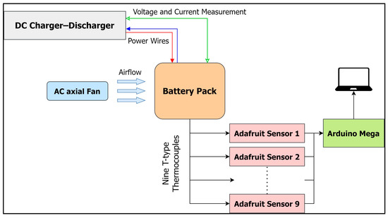 T-type thermocouples (5TC-TT-T-24-72 Omega), with a reported accuracy of ±0.5 °C, were installed to monitor the temperature distribution within the battery pack. Nine thermocouples were attached to the surface of the batteries at the center of the total height, capturing temperature data from all sides of the batteries, as depicted in Figure 1b. Each thermocouple was connected to an Adafruit 3263 temperature sensor (±0.075 °C reported accuracy) and interfaced with an Arduino Mega microcontroller (Elegoo MEGA 2560 R3). The temperature readings were transmitted to a computer via the Arduino terminal connection for real-time monitoring and data logging. A schematic of the data acquisition and electrical setup is provided in Figure 3.