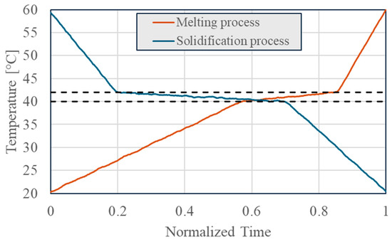 Paraffin 40–42 PCM temperature profiles of melting and solidification (time axis is normalized for better visualization of the temperature profile).