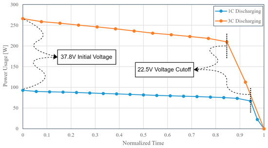 For the discharging procedure, the series-connected batteries were subjected to constant current discharges at rates of 1C and 3C, corresponding to currents of 2.5 ± 0.01 A and 7.5 ± 0.01 A, respectively, using the Multifunctional Load TDI RBL488 with specified accuracy. The discharge process continued until the total voltage dropped to 22.5 ± 0.01 V, corresponding to 2.5 V per cell. Thereafter, discharging proceeded with a constant voltage of 22.5 ± 0.01 V until the discharge current fell to 0.1 A, designated as the cutoff current per the manufacturer’s specifications. The discharge power usage profiles of the battery modules during the experiments are illustrated in Figure 5, where the horizontal axis is normalized by the total discharge times to facilitate better comparison between different discharge rates. The total discharge times for 1C and 3C discharge rates are approximately 66 min and 25 min, respectively.