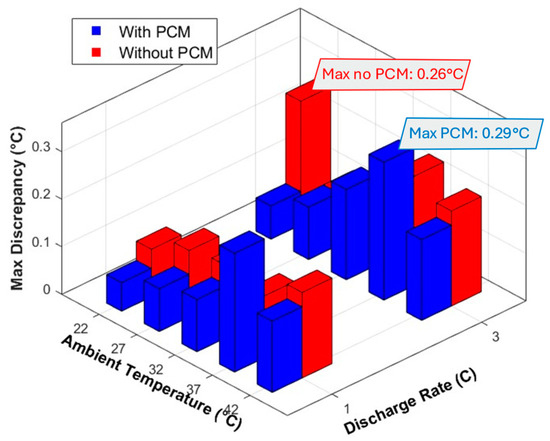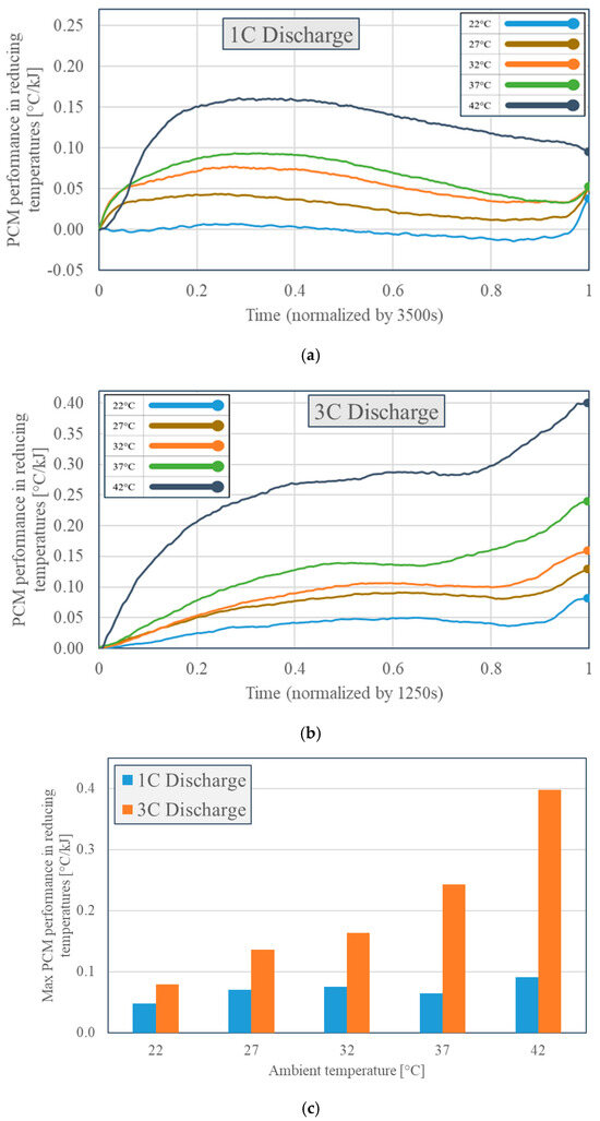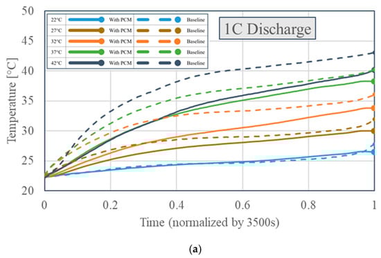 Figure 9a demonstrates the PCM performance at a 1C discharge rate for various ambient temperatures. At 22 °C, the PCM shows a minimal or even negative effect in the early stages of the discharge. This is because the ambient temperature is well below the PCM’s melting point (40–42 °C), preventing the utilization of latent heat absorption. However, towards the later stages of the discharge, the PCM starts to show positive cooling effects. This late improvement in performance can likely be attributed to the sensible heat storage of the PCM rather than latent heat absorption, as the system temperature remains below the melting point of the PCM. The PCM proves more effective for higher ambient temperatures as the system temperature approaches its melting point. However, even in these cases, the maximum temperatures during the experiment remain below the melting point of 40–42 °C, except for the cases of 37 °C and 42 °C ambient temperatures. For these two conditions, the maximum temperatures reach 38.2 °C and 40.3 °C, respectively, still slightly below the melting point of the PCM. Therefore, the cooling effect observed at the higher ambient temperatures of 27 °C, 32 °C, and 37 °C is largely influenced by the sensible heat storage. Only at 42 °C does the PCM utilize its latent heat capacity, where a significant reduction of up to 5 °C is achieved before the difference diminishes as the thermal management system reaches the ambient temperature during the second half of the experiment. Consequently, the current PCM has been underutilized under the 1C discharge rate since the maximum achieved temperature is below the melting point, and no latent heat absorption occurred at these conditions. If further reduction or stricter regulation of the maximum temperature is necessary under these conditions, a PCM with a lower melting point can be considered.