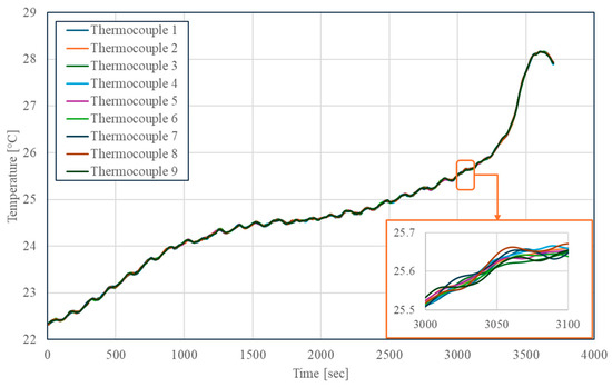 The surface temperature of all nine battery cells in distinct orientations was measured using nine thermocouples attached to the center of each battery, as depicted in Figure 1b. The thermocouples were strategically positioned to capture a comprehensive range of orientations, including facing the outer wall parallel and perpendicular to the inlet flow, facing the center of the chamber, and being adjacent to others. Each orientation was accurately monitored by a corresponding thermocouple. Figure 7 illustrates the temperature data for the baseline 1C discharge rate at an ambient temperature of 22 °C. The figure reveals that all recorded temperatures exhibit a variance of less than 0.1 °C. This value is below the estimated inherent experimental error in the measurement, demonstrating a high degree of temperature uniformity across the batteries. This consistent behavior was observed in other experiments as well across all tested ambient temperatures. Accordingly, only the temperature measured by thermocouple T1 will be presented and analyzed in subsequent analyses; any reference to temperature henceforth specifically pertains to T1 measurements.