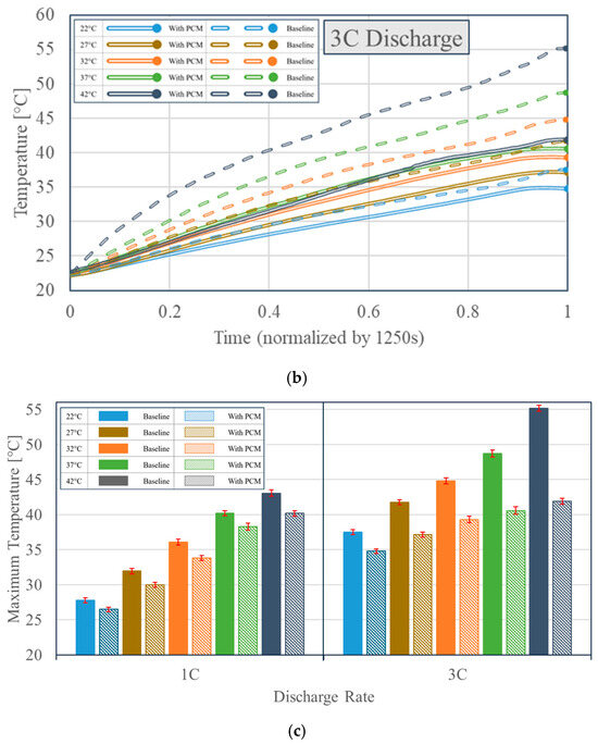 Figure 8c presents the maximum battery temperature measured under each experimental condition, with error bars indicating measurement uncertainties. The data show that, in the absence of a PCM, increases in ambient temperature led to a nearly constant upward trend in the maximum temperature for both the 1C and 3C discharge cases. By contrast, integrating PCM substantially moderates this temperature rise, especially once the system reaches the PCM’s melting range. This mitigating effect becomes more pronounced at higher discharge rates, where the batteries generate enough heat to activate the PCM’s latent heat storage capacity. Consequently, the maximum temperatures in PCM-equipped setups remain comparatively lower, underscoring the PCM’s effectiveness in stabilizing thermal behavior under demanding operational conditions.