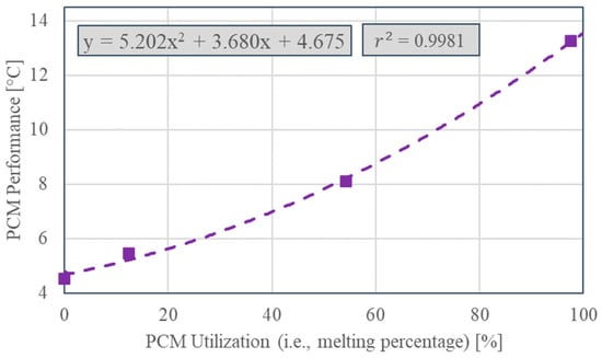 Additionally, considering the 3C discharge rate, the interpolation of Figure 9 and the melting percentage data indicate that the PCM started contributing its stored cooling capacity (i.e., latent heat) to the system after achieving a 4.6 °C reduction in maximum temperature. Figure 10 illustrates the corresponding interpolation analysis. The second-degree polynomial interpolation analysis yielded R-squared values of 0.9981. From this analysis, it can be inferred that the maximum utilization of PCM at a 3C discharge rate (i.e., 100% melting) corresponds to a PCM performance of approximately 13.6 °C in maximum temperature reduction. Note that the formula derived from the 3C discharge rate results cannot be applied to the 1C analysis. Furthermore, the PCM melting percentage, as described in Equation (3), pertains solely to the close proximity of the thermocouple probes and should not be interpreted as the total melting fraction.